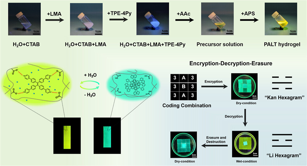 具有抗溶胀性能的荧光水凝胶在信息加密领域展现出重要应用前景,然而其在实际应用中常受限于环境波动引起的信号不稳定或响应模式单一等问题。本研究通过丙烯酸(AAc)与甲基丙烯酸月桂酯(LMA)的胶束共聚反应,成功构建了一种具有抗溶胀性能的荧光水凝胶,并将pH响应的聚集诱导发光(AIE)型荧光剂四(4-吡啶基苯基)乙烯(TPE-4Py)引入体系。由于TPE-4Py的可逆质子化/去质子化作用,结合聚合物网络在水合/脱水循环过程中的动态结构演变,该荧光水凝胶实现了从545纳米到508纳米的可逆荧光波长位移,并伴随着显著的荧光强度变化。此外,该荧光水凝胶对不同金属阳离子表现出差异化的荧光响应特性。通过调控特定金属阳离子的种类、浓度及环境湿度,该水凝胶实现了灵活的多维信息加密,显著提升了数据安全性。这种多维策略有效克服了传统静态或单模式加密技术的局限性。该平台为发展先进的动态防伪技术和安全信息存储提供了一种可靠且抗干扰的解决方案。